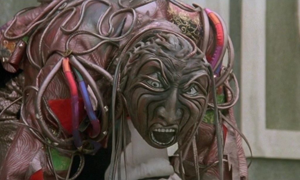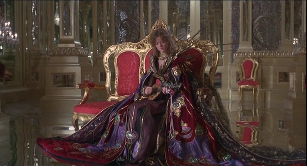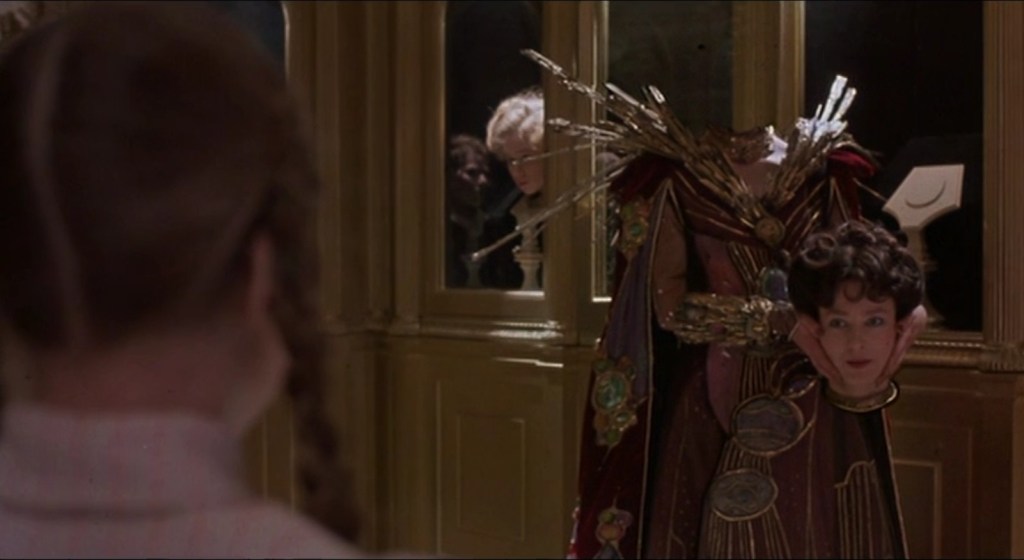 Princess Mombi is the woman who made me fall in love with horror. We first meet the Princess in her castle, ensconced a blinding room of gold and mirrors. Her costume is perfection. She’s draped in yards of expensive fabric, with long gold spikes extending behind her shoulders like gilded porcupine quills. When Dorothy, Tik-Tok, and Billina enter the room, she’s elegantly perched on a red tufted throne that looks straight out of Versailles, solely focused on playing her ribboned lute. She even yawns before extending a limp wrist and asking Dorothy to ‘help her rise’ – an unexpected yet impressive power move.