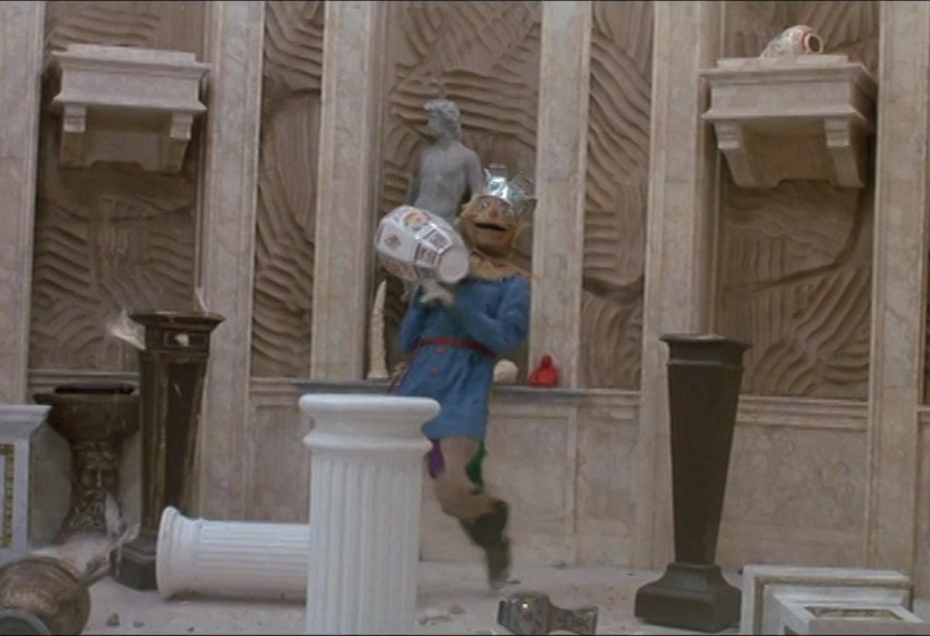 One by one the entire gang is turned into knickknacks; and every time someone is transformed, The Nome King grows more human – as if physically absorbing their lifeforce. The subtle yet deliberate physical changes to The Nome King throughout the ‘game’ sequence from full stone to nearly human is masterfully done and wonderfully disturbing.
